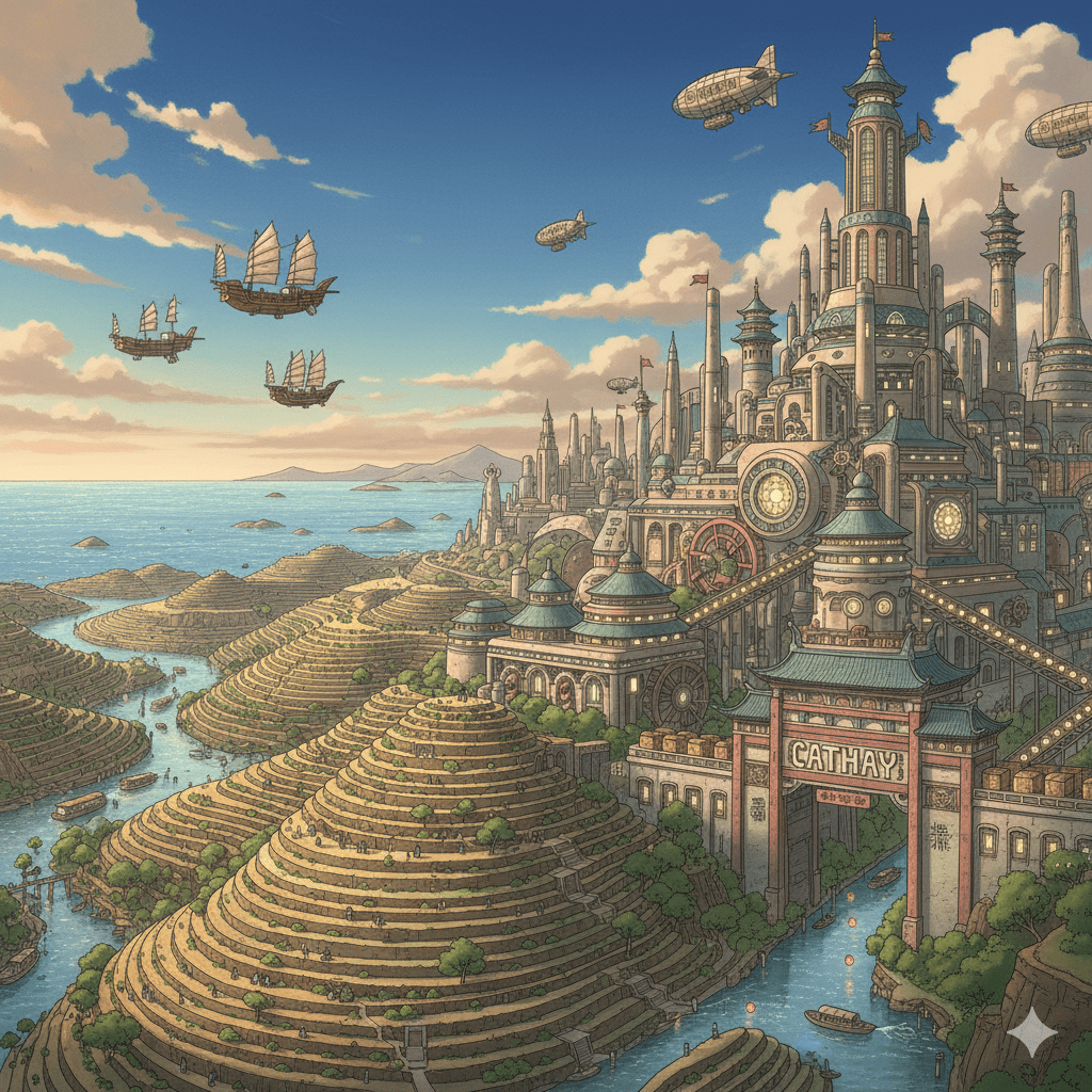 Jenseits des schimmernden Meeres liegt "Cathay", ein Land sorgfältiger Handwerkskunst und alter Weisheit, wo endlose terrassierte Felder auf zukunftsgerichtete Fabriken treffen, die mit stiller Bestimmtheit summen.