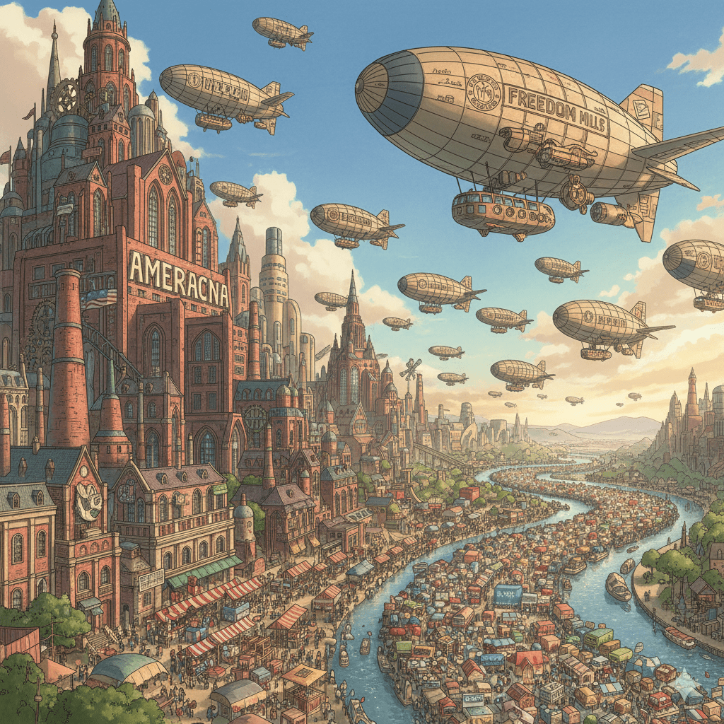 Stellen Sie sich, wenn Sie wollen, einen riesigen, geschäftigen Marktplatz vor, wo Waren wie ein lebendiger Fluss fließen. Auf der einen Seite die kolossale, alte Stadt "Americana", angetrieben von Innovation und Tradition, deren Himmel mit schwebenden Luftschiffen der Erfindung gesprenkelt ist.