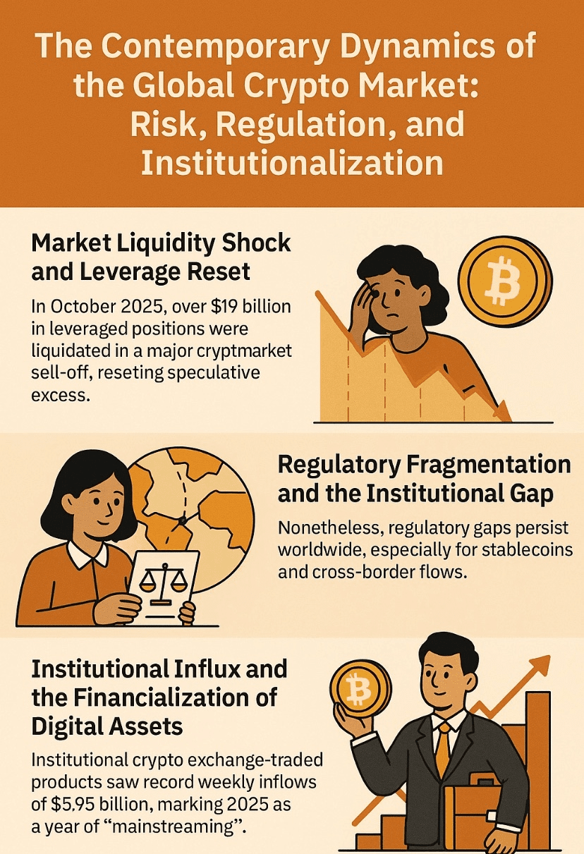 Diese Phänomene zeigen eine Branche, die zwischen Autonomie und Assimilation navigiert, in der jede Störung auch eine Gelegenheit zur Neuerfindung darstellt. Über Zahlen und Diagramme hinaus spiegelt der Krypto-Markt nun eine tiefere psychologische und soziotechnische Evolution wider: die Migration von spekulativer Begeisterung hin zu gemessener Legitimität. Vor diesem Hintergrund untersucht die folgende Analyse drei miteinander verbundene Dimensionen – Risiko, Regulierung und Institutionalisierung – um zu bewerten, wie das digitale Vermögensökosystem gleichzeitig reift und die globale Finanzordnung neu definiert.
