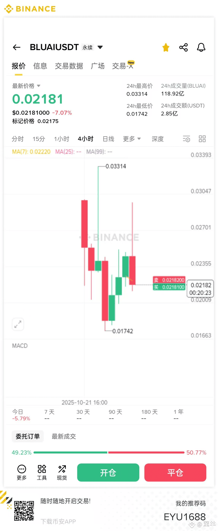 再看代币走势基于图表,BLUAIUSDT当前报价0.02181,24h跌幅7.07%,短期均线MA7位于0.0222,略高于现价,显示近期承压。24h成交量高达118亿,流动性充足但卖压明显。若无法站稳0.022支撑,可能下探前低0.0174。短期走势偏空,需观察能否放量突破0.025阻力位。