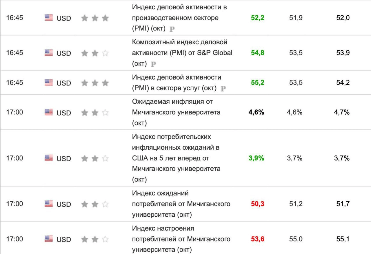 - Index der Verbraucherinflationserwartungen in den USA für die nächsten 5 Jahre von der Universität Michigan (Oktober): 3,9% bei einer Prognose von 3,7% und dem vorherigen Wert von 3,7%. Die Bevölkerung glaubt weiterhin nicht an einen Rückgang des Preisdrucks auf lange Sicht. Das ist ein Problem für die Märkte, da es die Risikobereitschaft einschränkt.