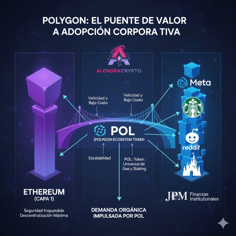 3. Auf der rechten Seite: Die Giganten der Adoption: Auf der anderen Seite der Brücke sehen wir die Unternehmen, die Polygon angezogen hat: Meta, Starbucks, Reddit, Disney und institutionelle Finanzen (JPMorgan). Diese Giganten stehen für die massive Adoption von Web3.