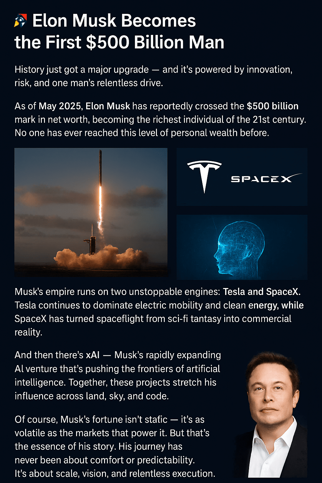 Im Mai 2025 hat Elon Musk Berichten zufolge die Marke von 500 Milliarden Dollar an netto Vermögen überschritten und ist damit die reichste Person des 21. Jahrhunderts. Niemand hat jemals dieses Niveau persönlicher Wohlstands erreicht.