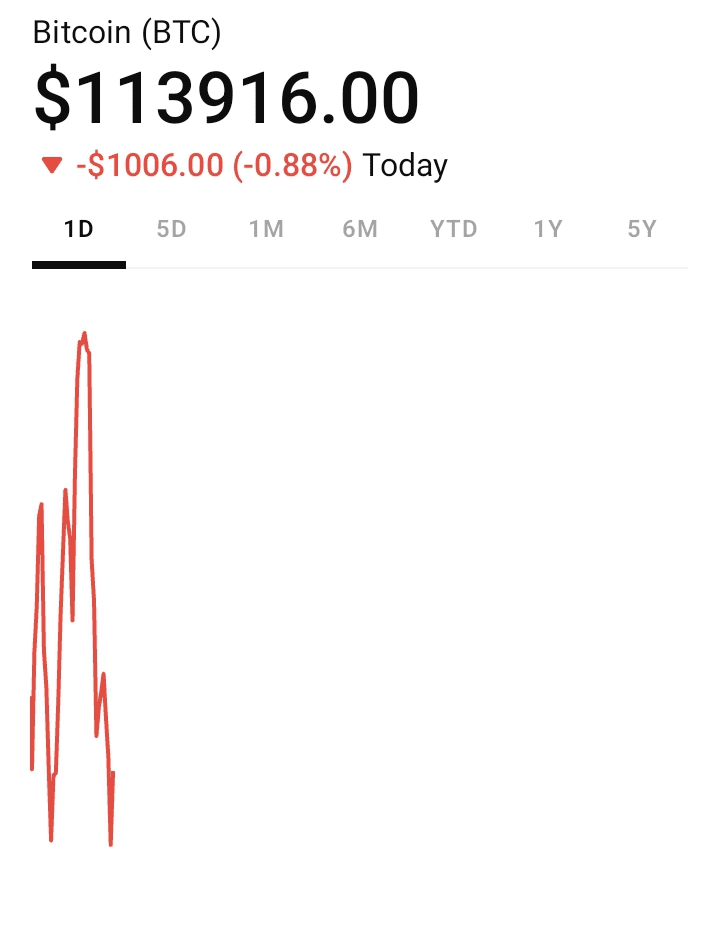 Bitcoin wird derzeit bei etwa 113.916 USD gehandelt, was einem leichten Rückgang von etwa -0,875% gegenüber dem vorherigen Schlusskurs entspricht.