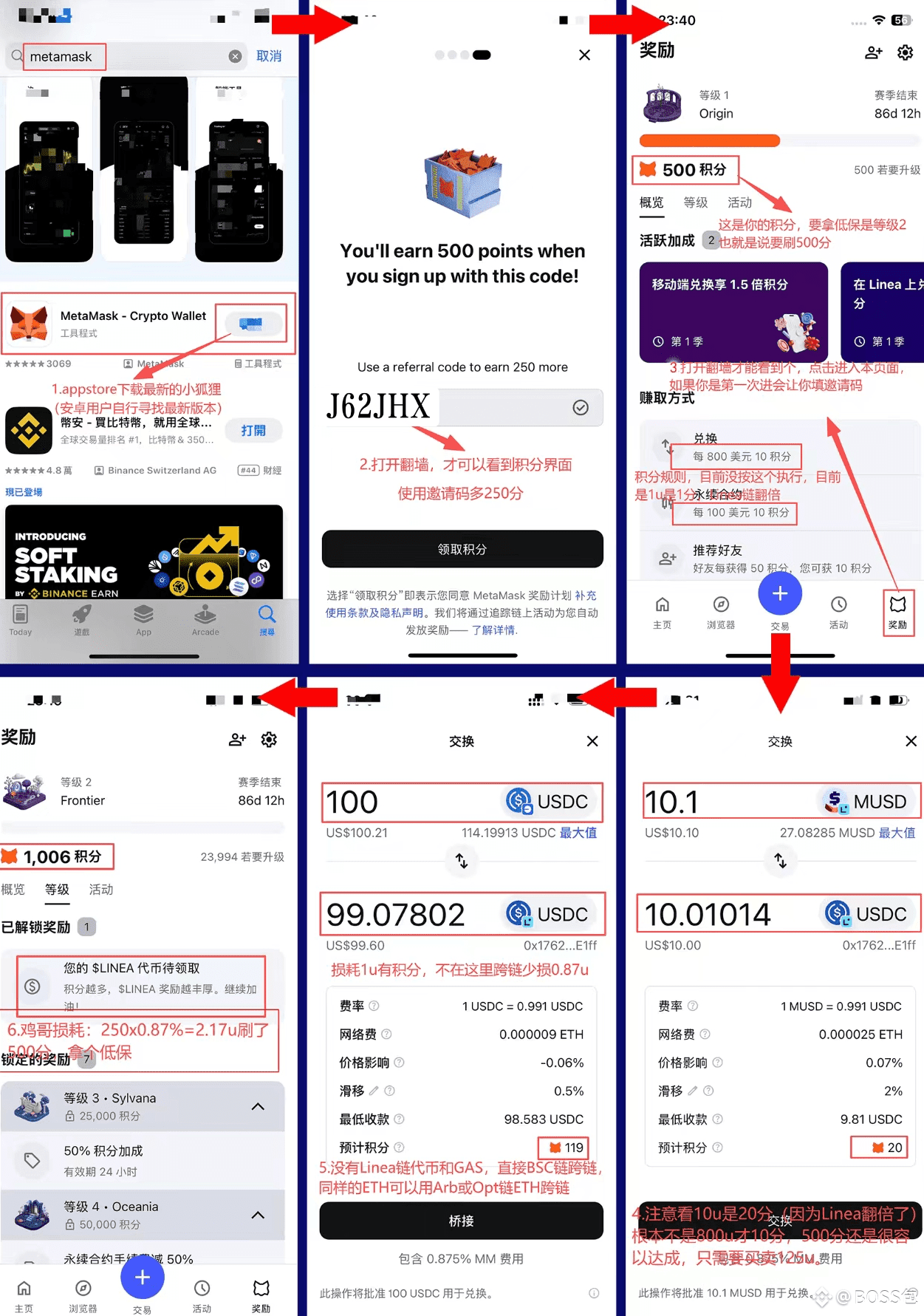 2.打开翻墙,开启积分页面,使用邀请码+250分:J62JHX. 3.跨链ETH为Linea_eth做GAS(建议ARB链eth),跨链USDC为Linea链(建议ARB链usdc,bsc链USDC)。