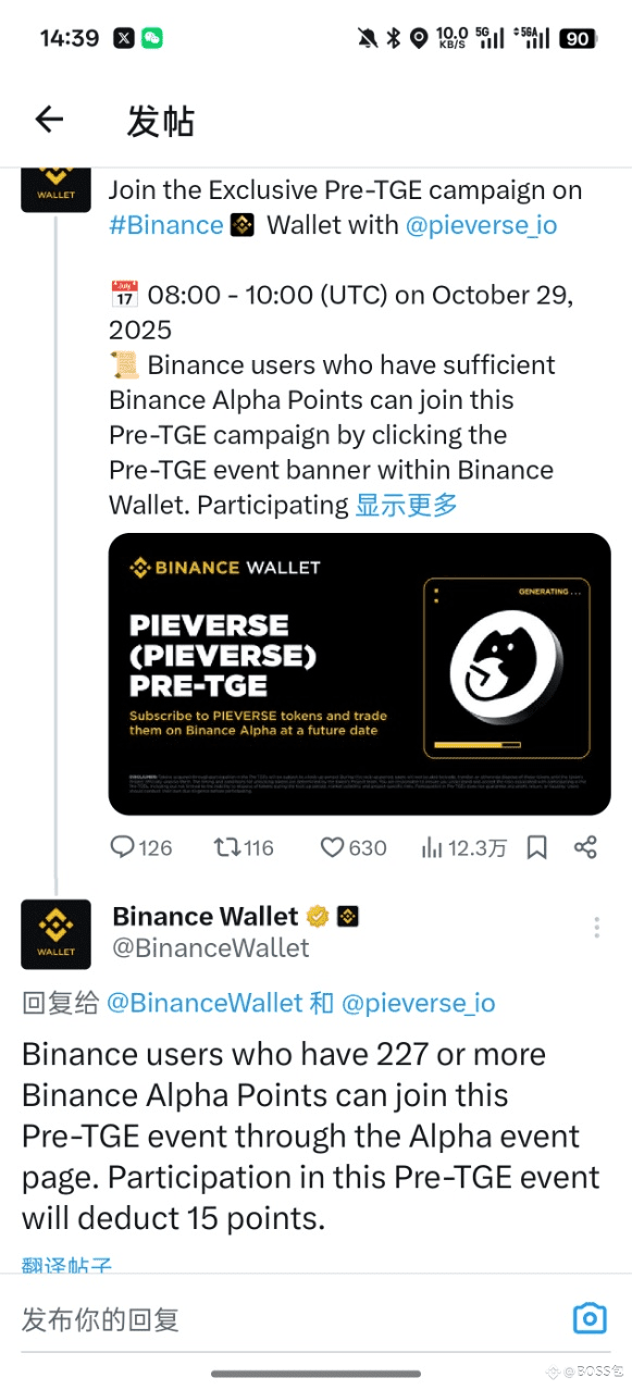 币安钱包宣布拥有 227 个或以上 Binance Alpha Points 的用户可通过 Alpha 活动页面参与 Pieverse Pre-TGE 活动,参与活动将扣除 15 个积分。