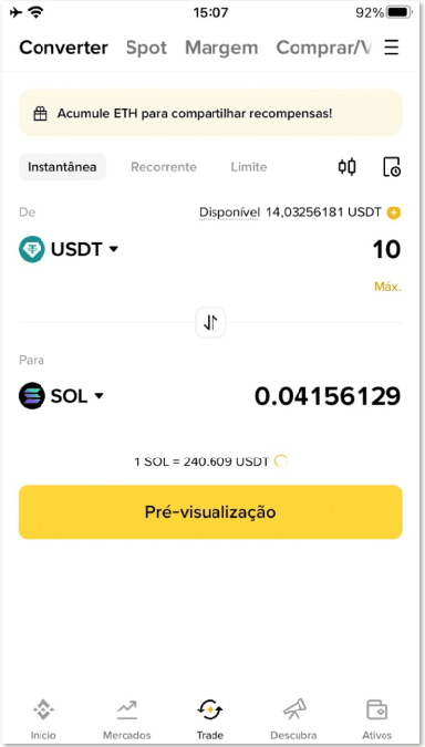 In diesem Beispiel haben wir den Binance Converter verwendet, um 10 USDT (Tether) in Solana (SOL) zu tauschen. Der Prozess wurde in Sekunden abgeschlossen und ohne Transaktionsgebühren. Lassen Sie uns zu den Bildschirmen übergehen!