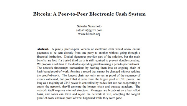 Dies ist im ersten Satz der Zusammenfassung des Whitepapers zu sehen: "Eine Version von elektronischem Cash von Peer zu Peer wird es ermöglichen, Zahlungen online direkt von einer Partei zur anderen zu senden, ohne durch eine Finanzinstitution zu gehen."