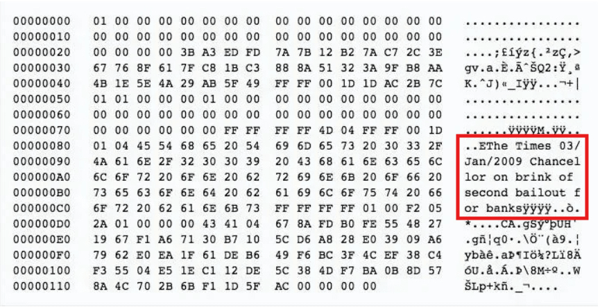 Diese Nachricht im Genesis-Block war die Schlagzeile der Times über die Reaktion des Vereinigten Königreichs auf die Finanzkrise 2007-2008. Nakamoto sprach sich gegen die Idee aus, dass Finanzinstitute zu groß sind, um zu scheitern, und wollte, dass Bitcoin anders ist.