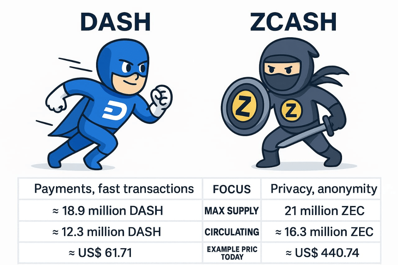 👉 Dash vs Zcash Grundlagen, ⚖️ regulatorischer Einfluss, 💥 Datenschutz-Krypto-Boom, 💰 Preis-Meilensteine ($30B → $100B) und 📆 vollständiger Ausblick bis 2030.