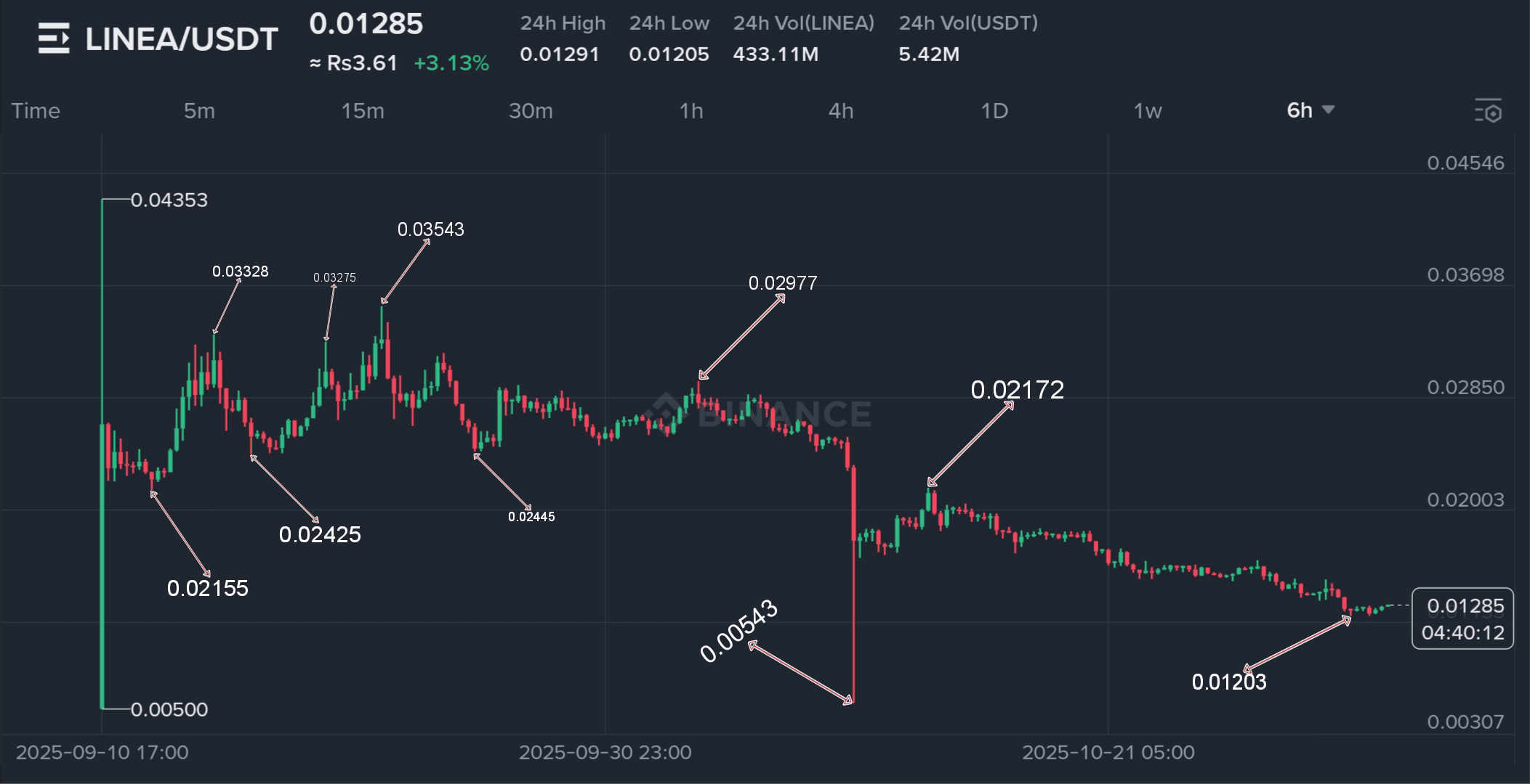 Angetrieben von bullischem Momentum erreichte Linea dann einen weiteren Hรถchststand von $0.03543, was einen neuen Meilenstein markiert. Der Markt korrigierte sich jedoch erneut, und der Preis fiel auf $0.02445. Nach einer seitlichen Bewegung machte der Token einen kurzen Aufwรคrtsbewegung auf $0.02977, bevor er in einen allmรคhlichen Abwรคrtstrend eintrat, der zu seinem niedrigsten Rรผckgang von $0.00543 fรผhrte. Der Token stabilisierte sich spรคter und erholte sich auf $0.02172.