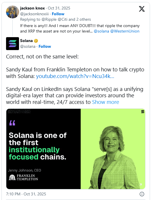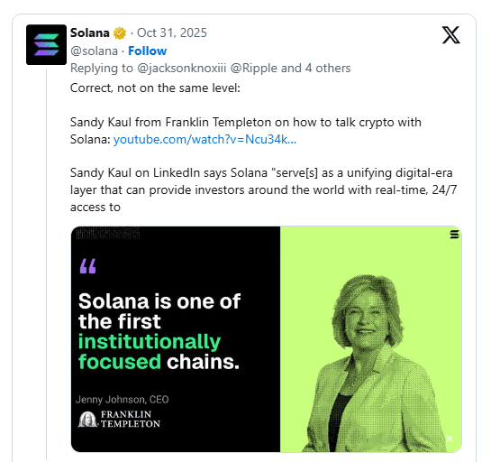 👉Solana Antwortet mit Institutioneller Unterstützung 🛡️ Das offizielle Management von Solana hat schnell geantwortet und erklärt: „Richtig, nicht auf demselben Niveau.“ 🎯 Die Antwort bezog sich auf respektierte Stimmen aus der globalen Finanzwelt, einschließlich der Führungskräfte von Franklin Templeton, die öffentlich die institutionelle Vorbereitung von Solana gelobt haben. 👑 Sandy Kaul, Leiterin der Digital Asset Strategy bei Franklin Templeton, beschrieb Solana kürzlich als „eine vereinigende Schicht der digitalen Ära, die Investoren 24/7 Zugang zu zuvor unerreichbaren Vermögenswerten bietet.“ Jenny Johnson, die CEO der Firma, nannte Solana ebenfalls „eine der ersten institutionell fokussierten Chains.“ 🏆