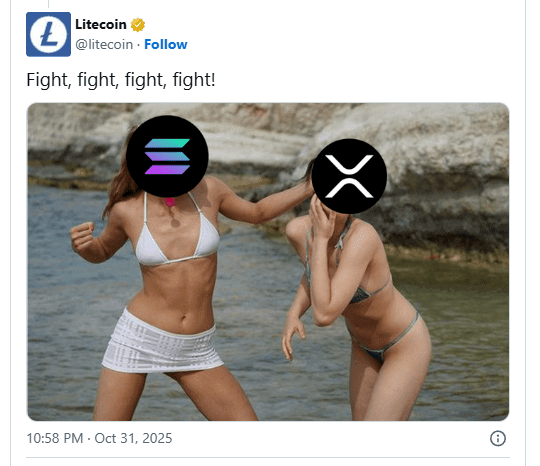 👉Litecoin Hebt die Stimmung 😂 Kurz darauf beteiligte sich das offizielle X-Konto von Litecoin mit einem humorvollen Meme an der Diskussion. 🐶 Es zeigte zwei Frauen, die als „Solana“ und „XRP“ gekennzeichnet waren, die kämpften, mit dem Titel „Kampf, Kampf, Kampf, Kampf.“ 🥊 Der Kommentar von Litecoin lockerte die Stimmung, betonte aber auch, wie das soziale Engagement die Sichtbarkeit fördert. 👀
