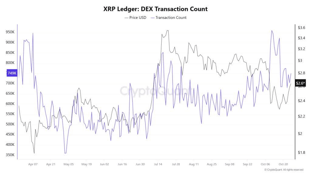 Interessanterweise zeigen On-Chain-Metriken vom XRP Ledger DEX bullische Signale. Seit Mai 2025, während die Preiskonsolidierung anhält, steigt die Anzahl der DEX-Transaktionen stetig, was darauf hindeutet, dass die Aktivität und Liquidität der Aufträge unter der Oberfläche aufgebaut werden.