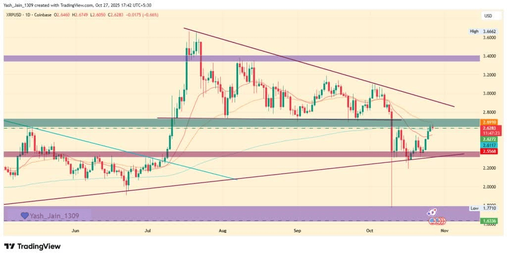 Derzeit schwankt der XRP-Preis um 2,62 $, mit einer Marktkapitalisierung von 157 Milliarden $ und einem Handelsvolumen von 4,49 Milliarden $ in 24 Stunden. Im XRP-Preischart konvergiert der Token innerhalb eines symmetrischen Dreiecks.