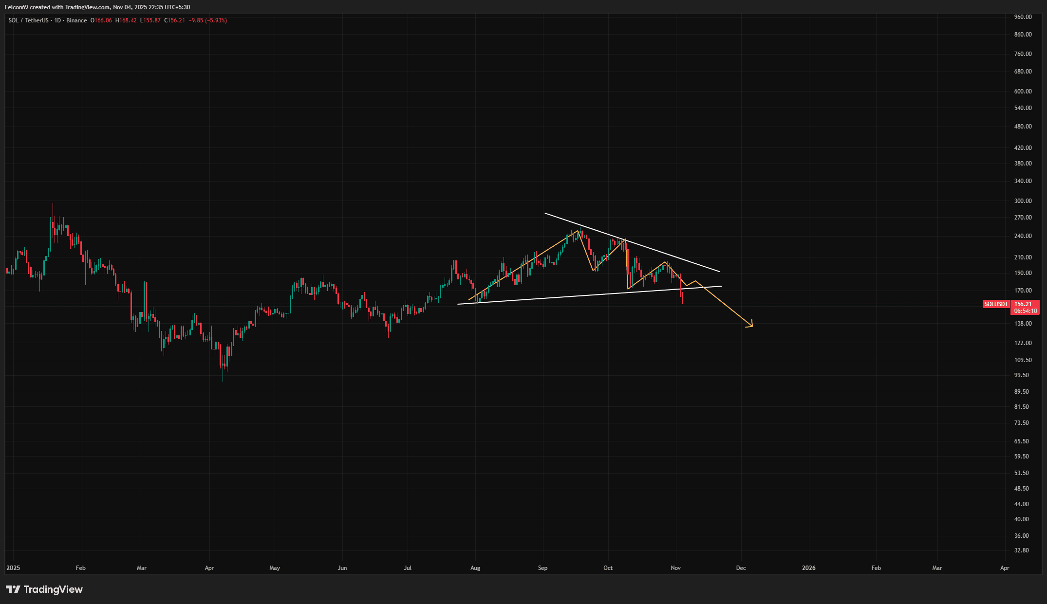 Ich kann auf SOL eine symmetrische diagonale Unterstützung und ein wichtiges horizontales Unterstützungsniveau in der Nähe von 175 $ sehen. Sol ist ein sehr starkes bärisches Signal, das auf eine wahrscheinliche Trendwende und Fortsetzung des Rückgangs hinweist. Das nächste Ziel von SOL möglicherweise rund 138 $ oder niedriger. Die Bullen haben versäumt, mehrere Unterstützungsniveaus zu verteidigen.