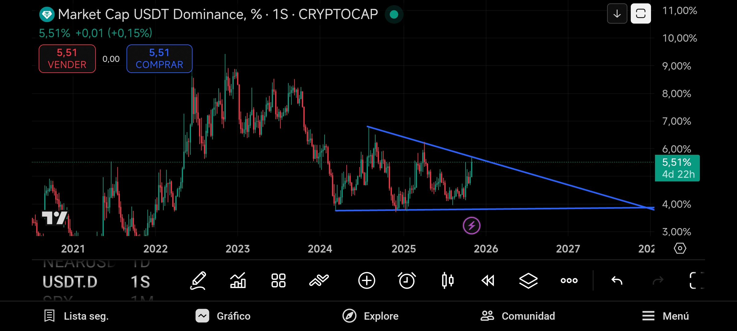 Wenn die Dominanz von USDT fällt 📉, deutet dies darauf hin, dass Kryptowährungen gekauft werden (Kapital wird aus Stablecoins abgezogen). Dies führt zu Preisanstiegen bei BTC und Altcoins und erzeugt eine bullische oder gierige Stimmung.