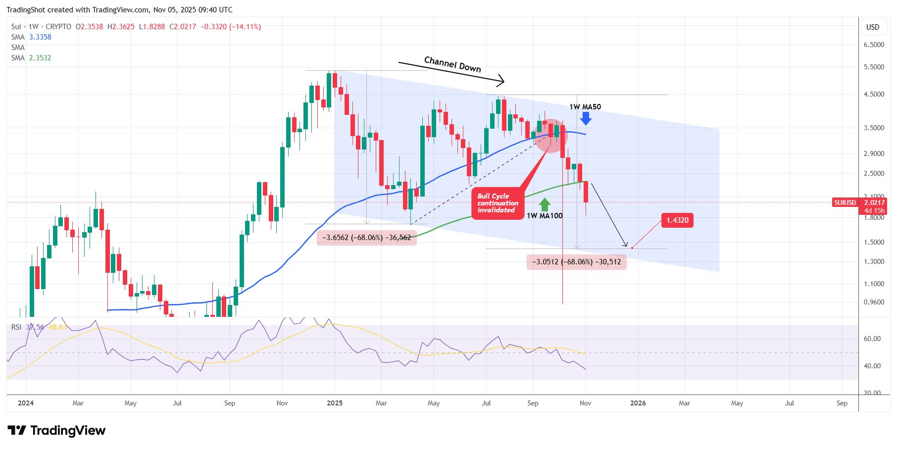 Sui (SUIUSD) hat einen Abwärtstrend (Channel Down) im 1W-Zeitrahmen etabliert und handelt unter den niedrigeren Hochs seit dem Hoch vom 30. Dezember 2024. Der Bullenzyklus wurde am 22. September 2025 ungültig, als der Preis unter die innere höhere Tiefs-Trendlinie (gestrichelt) brach, und diese Woche könnte den neuen Bärenzyklus bestätigen, da es sehr wahrscheinlich ist, dass eine 1W-Kerze unter dem 1W MA100 (grüne Trendlinie) schließt.