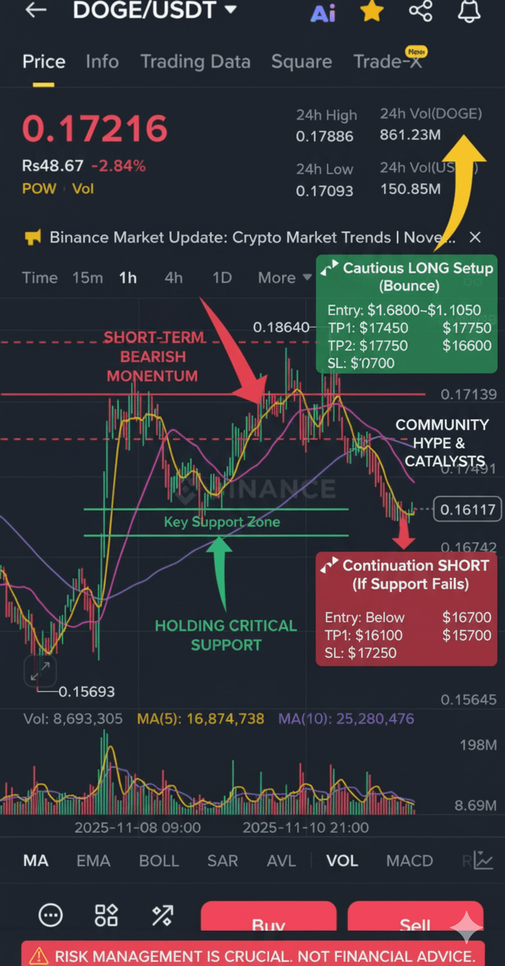 Das DOGE/USDT 1-Stunden-Diagramm zeigt, dass der Preis derzeit konsolidiert, nachdem er kürzlich leicht gefallen ist, und Unterstützung auf einem entscheidenden Niveau findet. Der allgemeine Markttrend für Dogecoin hinkt oft hinter großen Münzen wie $BTC her, aber die Stimmung bleibt von seiner starken Community und potenziellen hochkarätigen Katalysatoren beeinflusst.