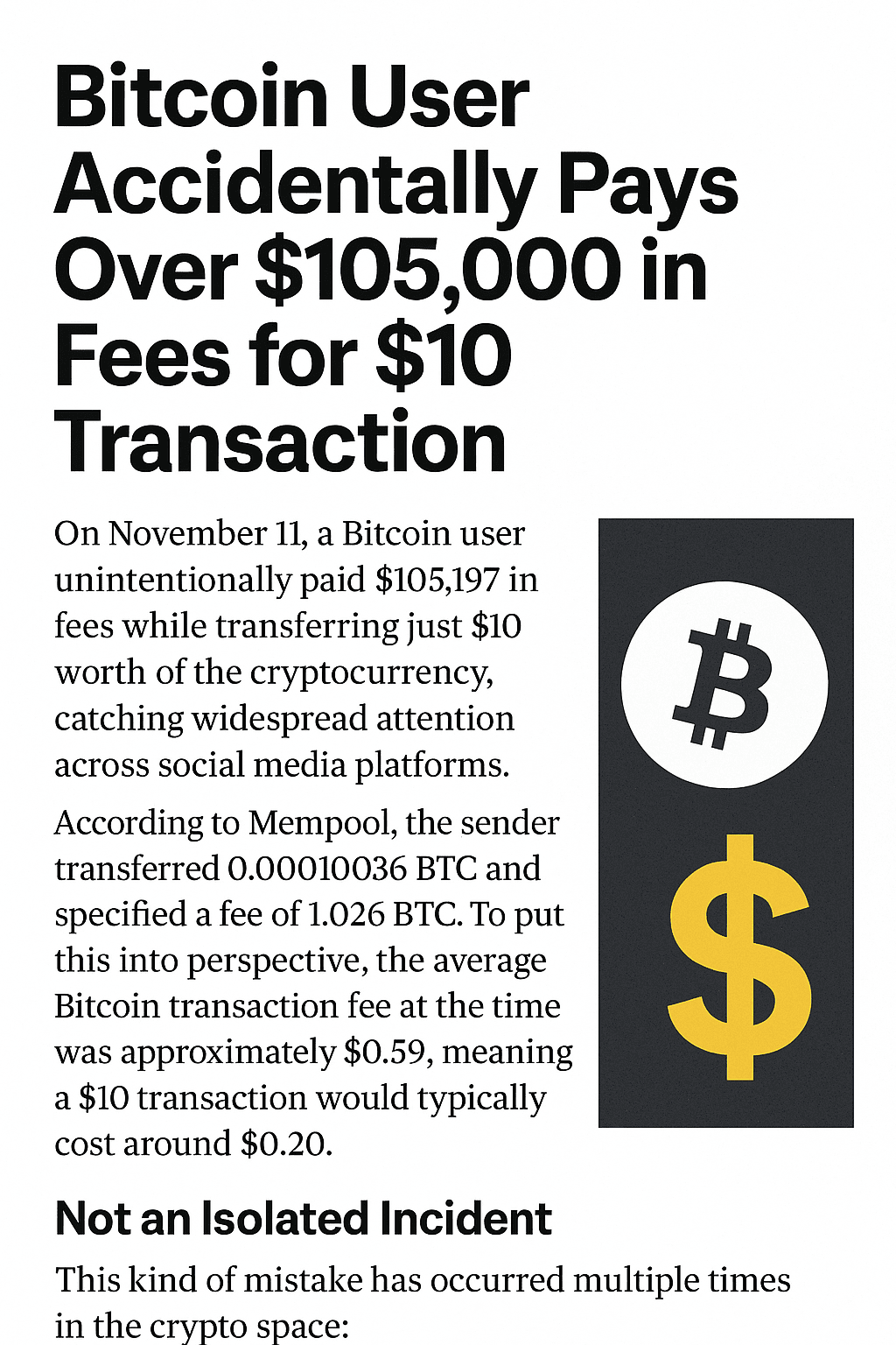 Am 11. November hat ein Bitcoin ( $BTC Benutzer versehentlich 105.197 $ an Gebühren gezahlt, während er nur 10 $ in der Kryptowährung überwiesen hat, was große Aufmerksamkeit in den sozialen Medien erregte.