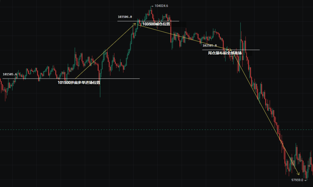 Realistisch betrachtet, obwohl wir bisher stets kurzfristig gedacht haben, glaubten wir gestern dennoch an eine mögliche Bodenbildung mit einem Teilrückgang, weshalb wir eine Long-Position eingerichtet haben. Rückblick: Wer kauft, ist der Schüler, wer verkauft, ist der Meister. Echtzeit-Positionierung gestern: Long-Position bei 101.500, Halbposition bei 103.500 reduziert mit Stop-Loss auf Break-even, Abendliche Ausstieg der verbleibenden Position bei 102.500. Anschließend brach der Kurs direkt unter die 100.000-Marke. Nach der Rückblickanalyse wird deutlich, dass der Einstieg nahe dem Tief des Tages lag, die Reduzierung nahe einem relativen Hochpunkt und der vollständige Ausstieg sogar kurz vor dem Einbruch.