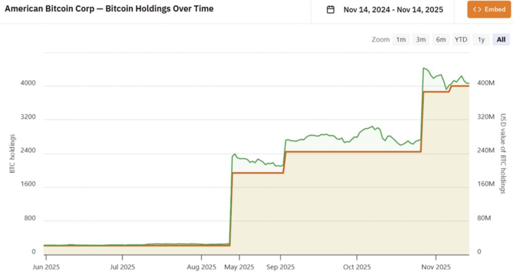 Trump beschränkt sich nicht auf Worte, sondern setzt seine Philosophie aktiv um. Sein Unternehmen American Bitcoin, das dieses Jahr durch eine Reverse-Merger-Transaktion mit Gryphon Digital Mining an die Börse kam, hat im dritten Quartal über 3.000 BTC hinzugefügt. Die Bitcoin-Reserve des Unternehmens überschritt 4.000 Münzen.