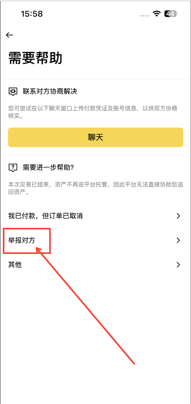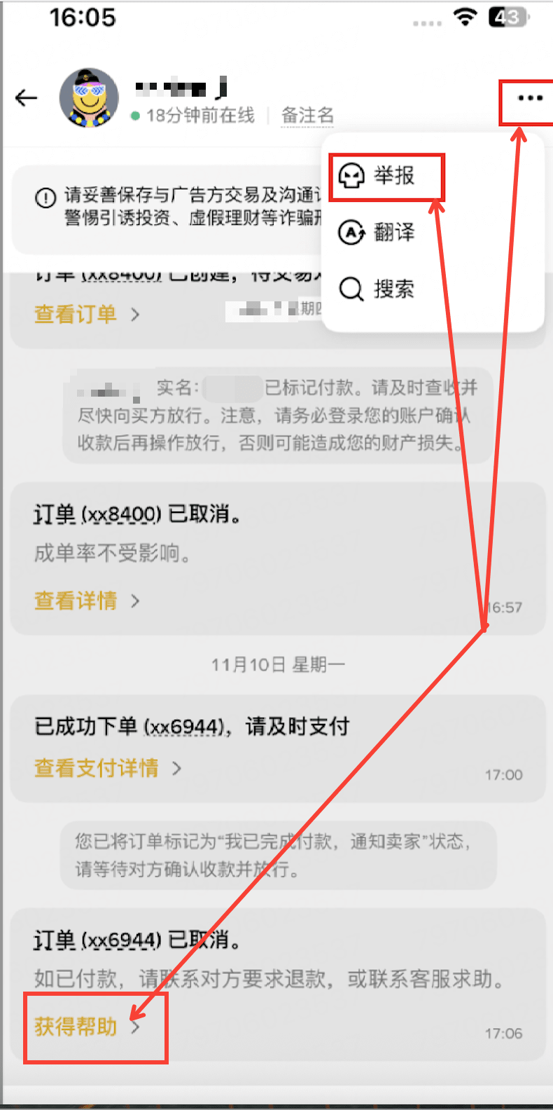 App-Seite: Klicken Sie auf das Gesprächsfenster der Bestellung in der oberen rechten Ecke auf die 【drei Punkte】, es öffnet sich ein Dialogfeld > Klicken Sie auf Meldung > Wählen Sie einen Grund und senden Sie ihn ab, der Web-Pfad ist identisch. Siehe Abbildung: