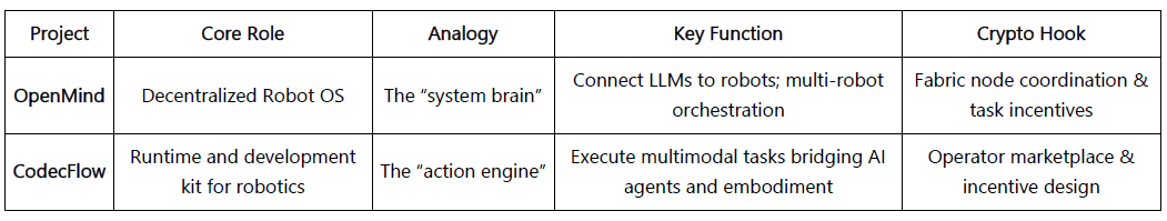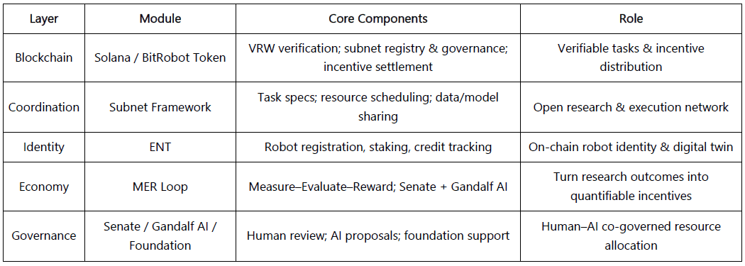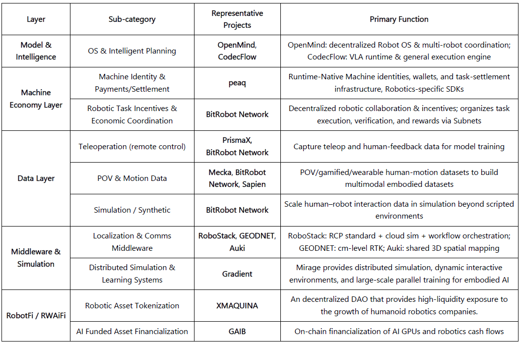 Basierend auf drei Kriterien – überprüfbare Fortschritte, technische Offenheit und industrielle Relevanz – kartiert dieser Abschnitt repräsentative Projekte an der Schnittstelle von Web3 × Robotik, organisiert in fünf Schichten: Modell & Intelligenz, Maschinenwirtschaft, Datensammlung, Wahrnehmung & Simulationsinfrastruktur und Robotervermögen & Erträge (RobotFi / RWAiFi). Um objektiv zu bleiben, haben wir offensichtlich hypegetriebene oder unzureichend dokumentierte Projekte entfernt; bitte weisen Sie auf eventuelle Auslassungen hin.