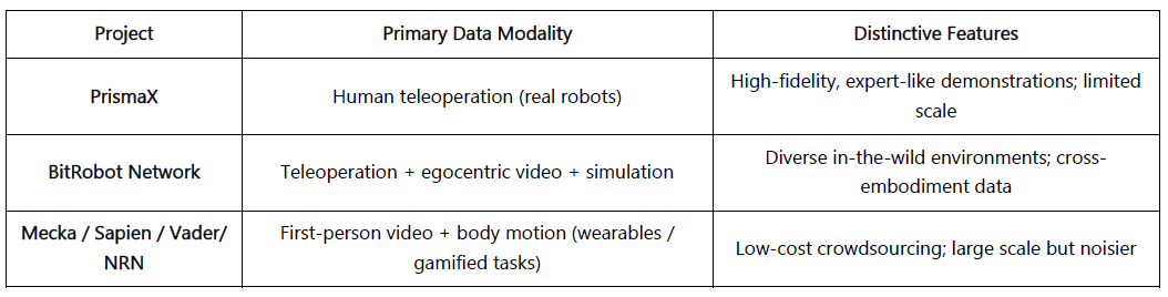 Zweck: Seltene, kostspielige reale Daten für verkörperte Trainings über Teleoperation (PrismaX, BitRobot Network), Ich-Perspektive & Bewegungserfassung (Mecka, BitRobot Network, Sapien, Vader, NRN) und Simulations-/synthetische Pipelines (BitRobot Network) zu erschließen, um skalierbare, generalisierbare Trainingskorpora aufzubauen.
