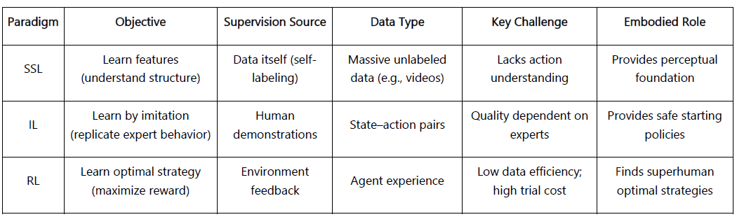 In Embodied AI bilden diese Paradigmen ein geschichtetes Lernsystem: SSL bietet repräsentative Verankerung, IL bietet menschliche Vorannahmen, und RL treibt die Politikoptimierung voran.