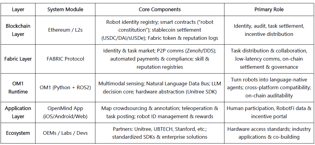 OpenMind fungiert als die intelligente Middleware zwischen LLMs und der Robotikwelt – wandelt Sprachintelligenz in verkörperte Intelligenz um und bietet eine Struktur von Verständnis (Sprache → Handlung) bis hin zu Ausrichtung (Blockchain → Regeln). Ihr mehrschichtiges System bildet eine vollständige Kollaborationsschleife: Menschen geben Feedback/Labels über die OpenMind-App (RLHF-Daten); das Fabric-Netzwerk kümmert sich um Identität, Aufgabenverteilung und Abwicklung; OM1-Roboter führen Aufgaben aus und halten sich an eine on-chain "Robot Constitution" zur Verhaltenskontrolle und Zahlung – und schließen einen dezentralen Zyklus von menschlichem Feedback → Aufgaben-Kollaboration → On-Chain-Abwicklung ab.