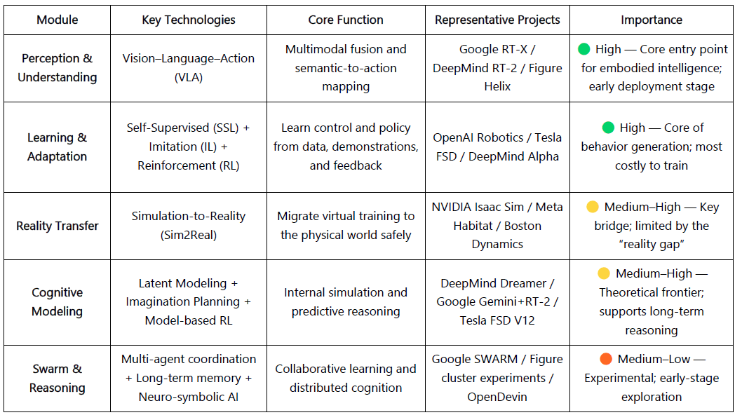 VLA (Wahrnehmungsfusion), RL/IL/SSL (Lernen), Sim2Real (Realitätsübertragung), Weltmodell (kognitives Modellieren) und Schwarm & Argumentation (kollektive Intelligenz und Gedächtnis).