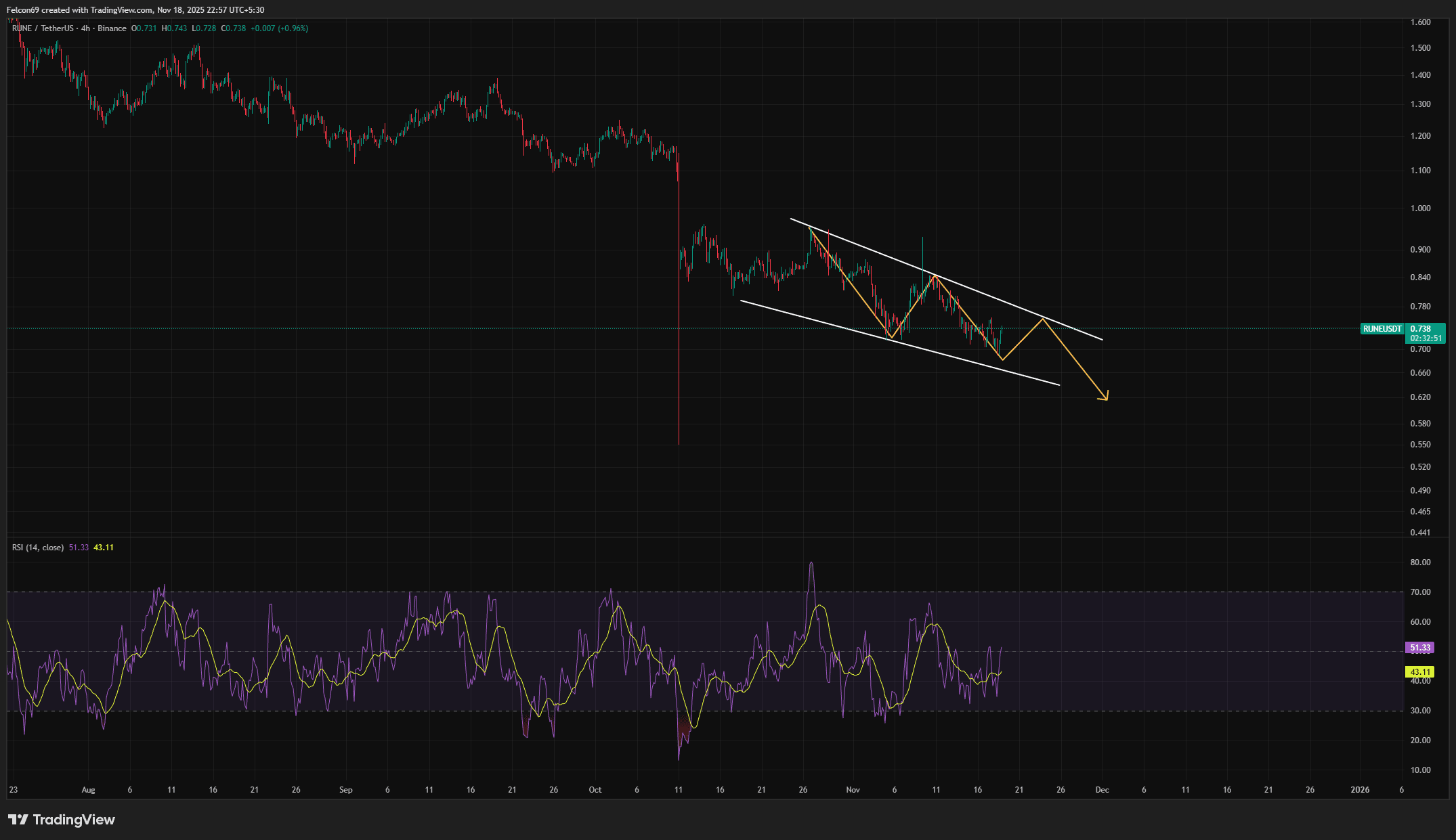 Ich kann ein absteigendes Kanal 🔽 Muster sehen, definiert durch zwei parallele, nach unten geneigte weiße Trendlinien. Dieses Muster wird oft als Bullenflagge oder bullishes Umkehrmuster ⬆️ angesehen. Der Preis befindet sich derzeit in der Nähe des Zentrums. Der projizierte Weg deutet auf eine Bewegung nach unten hin, um die untere Grenze in der Nähe von $0.65 zu testen, gefolgt von einem starken Anstieg und einem eventualen Ausbruch 🚀 über die obere Linie. Der RSI (unten) ist neutral. Achten Sie auf die untere Trendlinie für einen möglichen Rückprall.
