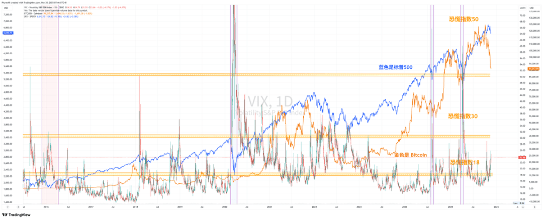 Die aktuelle Zeit ist sehr ähnlich zu Januar und Februar dieses Jahres. Es könnte sein, dass wir wie im April direkt in eine Panik geraten. Damals war es wegen Trumps Zollpolitik und dem Handelsstreit zwischen den USA und China, und dann gab es Mitte Oktober eine große Panik, hauptsächlich wegen der Stilllegung. Nach diesen beiden Ereignissen gab es vorerst keine Anzeichen für eine anhaltende Übertreibung über 30.