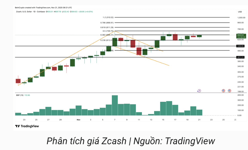 Der ZEC-Preis hält einen Aufwärtstrend nach dem Bruch des Flaggenmusters am 14.11. aufrecht. Käufer unterstützen kontinuierlich die Rückzüge, wodurch der Aufwärtstrend trotz des kontinuierlichen Verlusts wichtiger Unterstützungsniveaus bei BTC aufrechterhalten wird. Der entscheidende Widerstand liegt derzeit bei 749 USD; wenn dieser überschritten wird, hat ZEC die Chance, auf 898 USD und sogar auf 1.010 USD zu steigen.