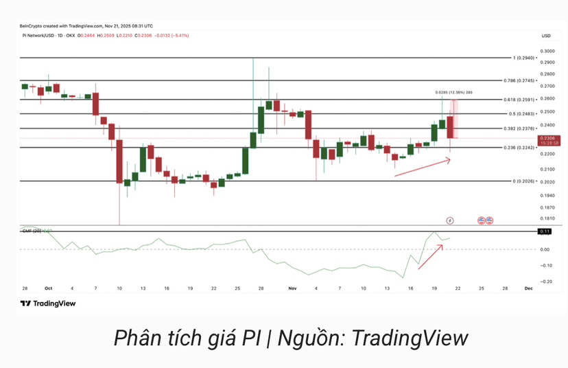 Der Geldfluss bestätigt auch die kurzfristige Stärke von Pi Coin. Der Chaikin Money Flow (CMF) – der große Geldflüsse in und aus Vermögenswerten misst – bleibt konstant über der Schwelle von 0, was zeigt, dass der Kaufdruck weiterhin vorherrscht. Vom 14. bis 21.11. bildeten sowohl der Preis als auch der CMF höhere Tiefs und spiegeln die starke Teilnahme großer Investoren an der jüngsten Erholung wider.