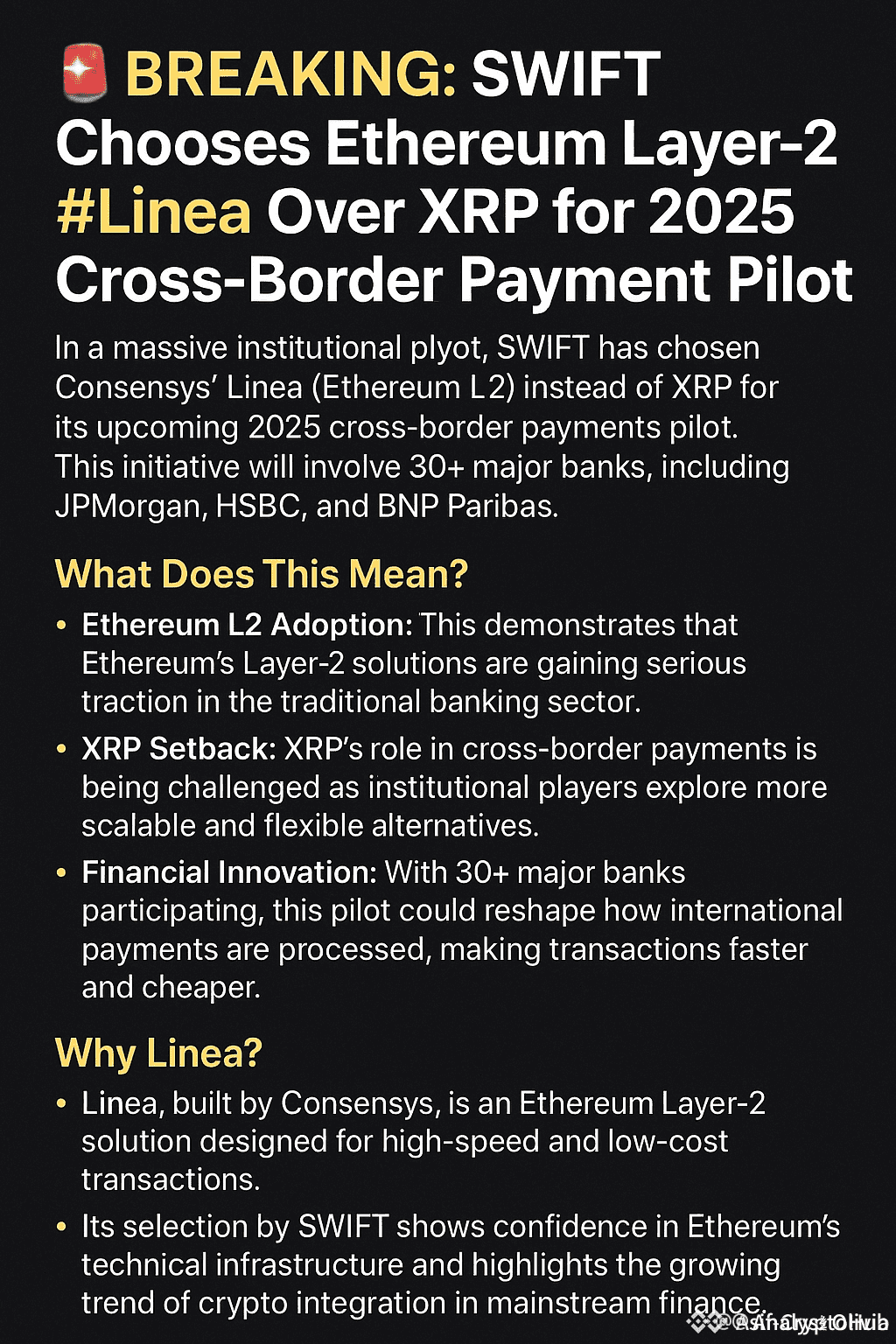 In einer erstaunlichen Wendung der Ereignisse, die die Krypto-Welt erschĂŒttert hat, hat SWIFT offiziell das Layer-2 Ethereum #Linea von Consensys ausgewĂ€hlt â NICHT XRP â fĂŒr sein enormes Pilotprojekt fĂŒr grenzĂŒberschreitende Zahlungen im Jahr 2025.