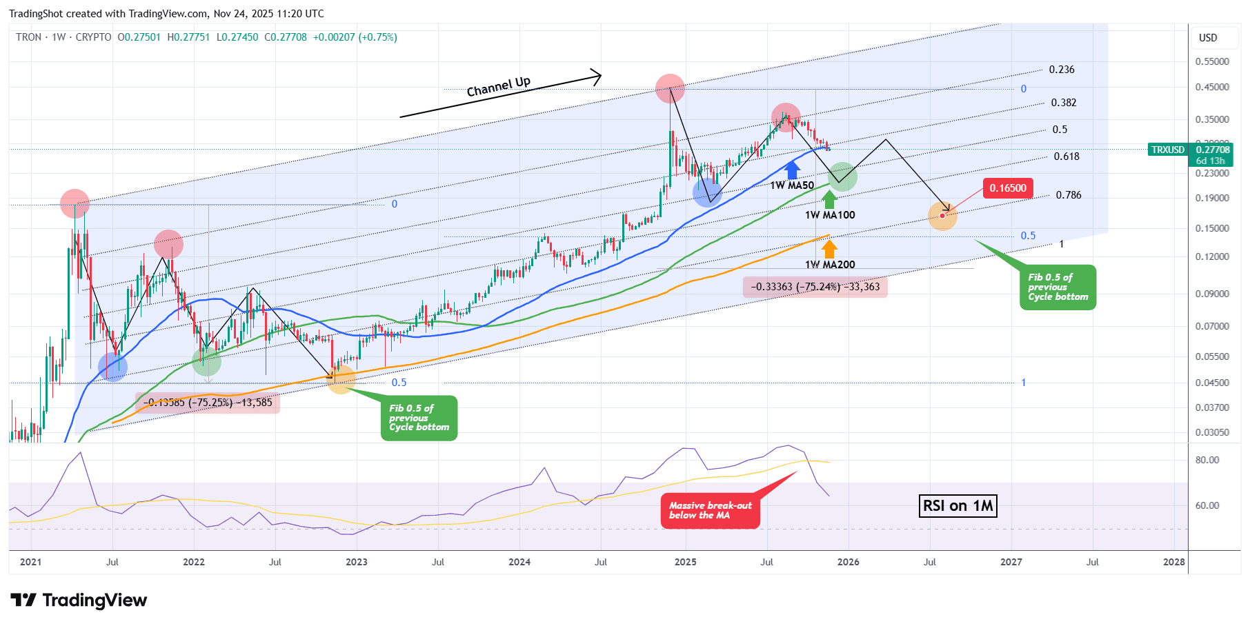 Unsere langfristige Prognose für einen Zyklusboden liegt bei 0,786 Fib, es sei denn, die 1W MA200 (orangefarbene Trendlinie) wird nach August 2026 erreicht. Andernfalls glauben wir, dass der Markt möglicherweise mindestens bei 0,16500 einen Boden finden könnte, was immer noch ein optimistischeres Szenario ist, da es sogar über dem 0,5 Fibonacci-Retracement-Niveau vom 14. November 2022 (vorheriger) Boden liegt.