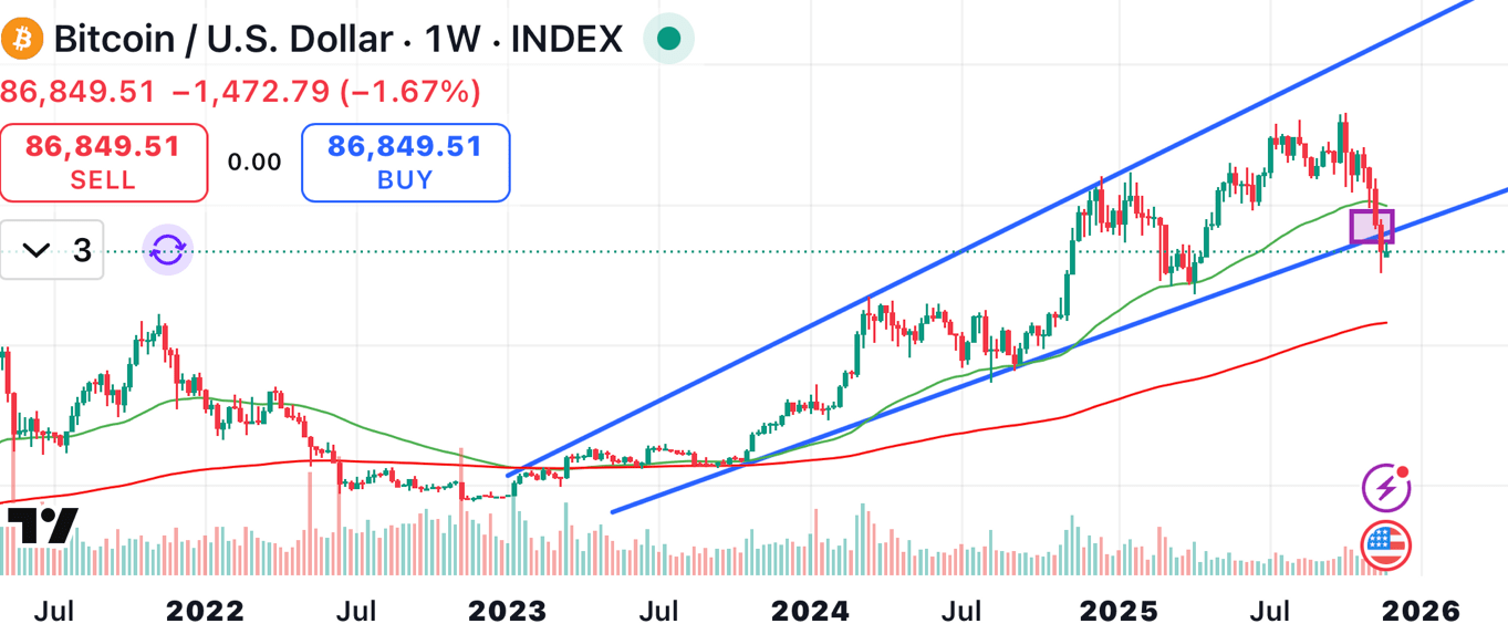 Heute ist der 25. November 2025, und wir sehen einen entscheidenden Moment für Bitcoin (BTC). Auf dem wöchentlichen (1W) Chart ist BTC an einer wichtigen Trendlinie und einem bedeutenden gleitenden Durchschnitt befestigt.