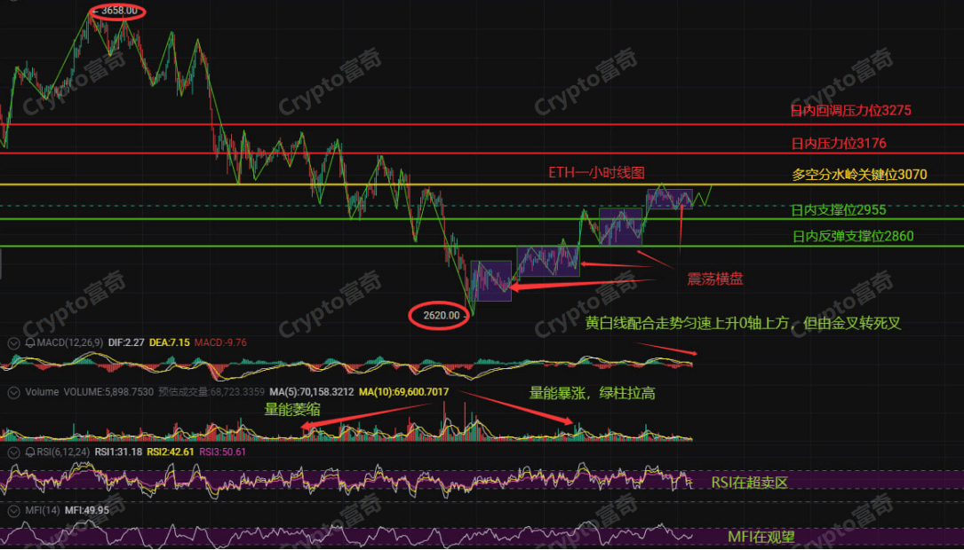 Aus der 1-Stunden-Kerze betrachtet, $ETH ist der Kurs von 2620 auf 3070 gestiegen, dabei gab es drei Phasen der Seitwärtsbewegung zwischen 2620-2860, 2860-2955 und 2955-3070, was zeigt, dass die Bullen schrittweise Kraft sammeln! Der aktuelle Preis testet wiederholt die 3070, die bei stabiler Überwindung das nächste Ziel bei 3176 Druckbereich sein wird! Aber seien Sie vorsichtig, das MACD zeigt ein Todessignal über der 0-Linie, das Volumen schwankt zwischen Rückgang und plötzlichem Anstieg, was auf einen intensiven Wettstreit zwischen Bullen und Bären hinweist! Der RSI ist zwar im überverkauften Bereich, aber die MFI zeigt eine abwartende Stimmung, kurzfristig könnte es noch Rückschlagsrisiken geben!