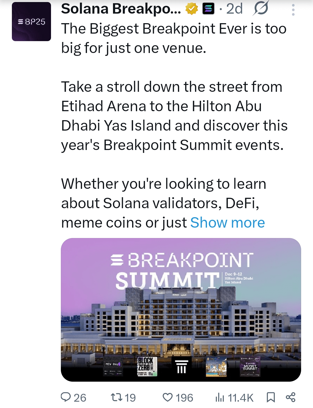 Kommende Ereignisse als Katalysatoren: Die Hauptkonferenz von Solana, Breakpoint 2025, beginnt vom 11. bis 13. Dezember in Abu Dhabi und zieht über 10.000 Builder, Institutionen und Gründer an, die Ankündigungen zu umsatzorientierten Upgrades, Partnerschaften (z. B. mit Visa/Mastercard-Erweiterungen) und DeFi-Innovationen machen. Davor wird die Solana Economic Zone Dubai (1.–7. Dezember) Web3-Builder ins Rampenlicht rücken und Investitionen aus den VAE anziehen, was historisch gesehen die $SOL 20–30% nach der Veranstaltung steigert. Diese stehen im Einklang mit dem größeren Hype im Ökosystem, einschließlich möglicher SOL-ETF-Zulassungen.