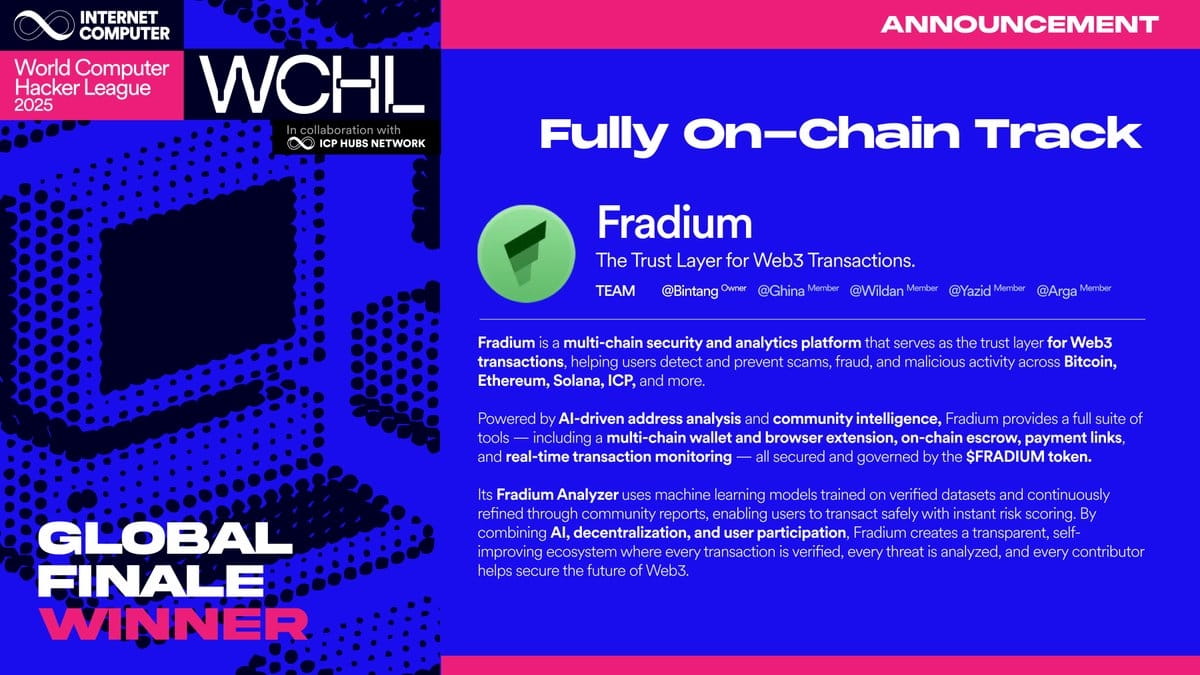Erster Platz: Fradium — Verbesserung der Sicherheit von Web3 durch Kombination von KI-gesteuerten Bedrohungserkennungen mit Abstimmungen der Community über das Vertrauen in Transaktionen.