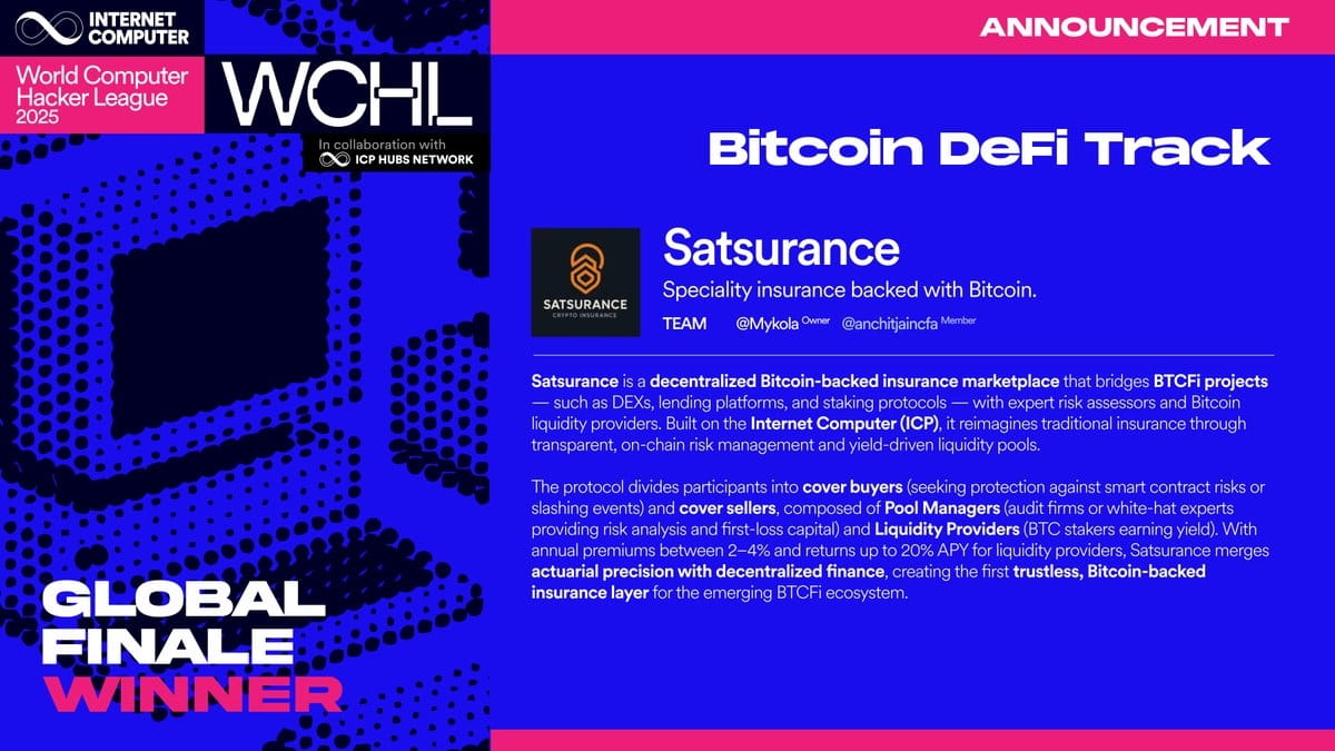 Zweiter Platz: Satsurance — Aufbau eines dezentralen Versicherungsmarktes, der Bitcoin-Inhaber und Risikoverwalter ermöglicht, Krypto-Risikoversicherungen abzuschließen oder zu kaufen.