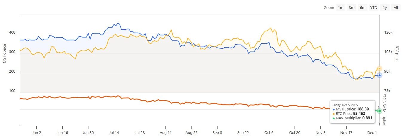 Die Firma MicroStrategy (MSTR), die größte Bitcoin-Holding-Gesellschaft der Welt, sah ihren Multiplikator auf das Nettovermögen der Vermögenswerte am 11. November auf weniger als 1,0 fallen, und blieb bis zum 5. Dezember bei 0,886 unter Wasser, gemäß den Bitcoin-Treasury-Daten.