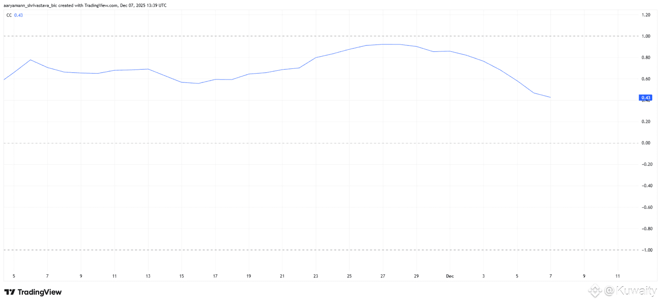 ضعفت العلاقة بين نوت كوين وبيتكوين بشكل كبير، حيث انخفضت إلى 0,43. يُظهر هذا الانخفاض السريع أن نوت لم يعد يتبع تحركات أسعار بيتكوين عن كثب. مثل هذا الفصل يمكن أن يكون مفيداً إذا استمرت $BTC في تقلباتها أو سجلت انخفاضات إضافية، حيث قد يتجنب نوت ضغط الهبوط المباشر.