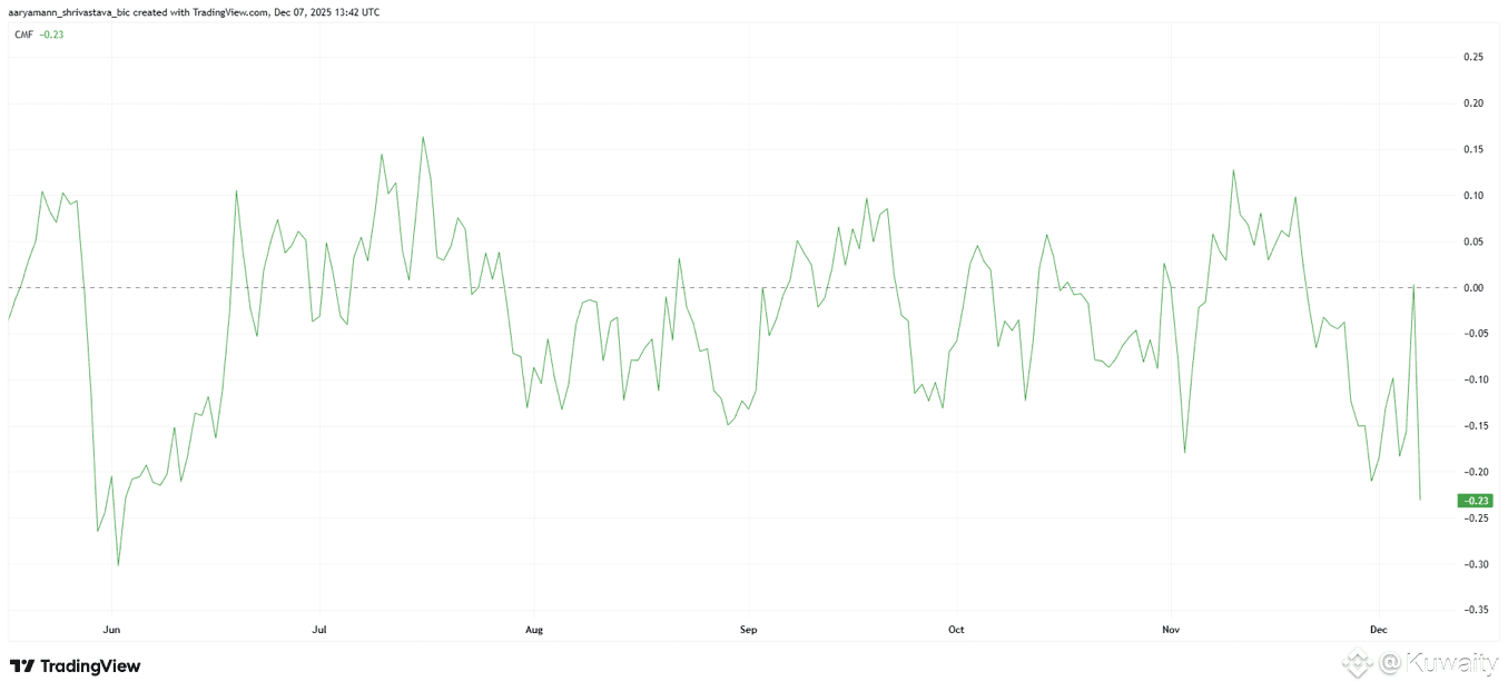 يظهر مؤشر تدفق المال الخاص بـ Chaikin انخفاضاً حاداً خلال الـ24 ساعة الماضية، مؤكداً على التدفقات الخارجة الثقيلة. وقد تحرك المؤشر إلى منطقة سلبية أكثر، مشيراً إلى أن المستثمرين خرجوا بسرعة من مراكزهم بعد المسيرة. من المرجح أن العديد منهم باعوا لتحقيق الأرباح أو لتقليل المخاطر، مما ساهم في التراجع الحاد.