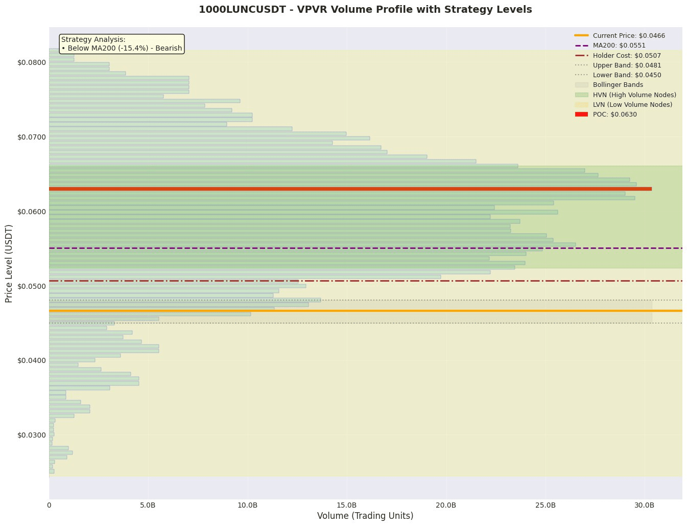 1. Wertankerbereich: Basierend auf den VPVR-Daten liegt der aktuelle Preis (0.04662) weit unter dem Bewertungsbereich (0.05117 - 0.07042) und dem POC (0.06297). Dies bedeutet, dass der aktuelle Preis sich in einem 'Wertloch' oder 'Überverkaufsbereich' des Marktes befindet, während der Bereich von 0.05117 bis 0.07042 eine dichte Ansammlung verlorener Positionen darstellt, wobei der POC (0.06297) die Kernwiderstandszone ist. Ein Preisanstieg wird zunächst auf die Prüfung von 0.05117 (untere VA-Grenze) stoßen.