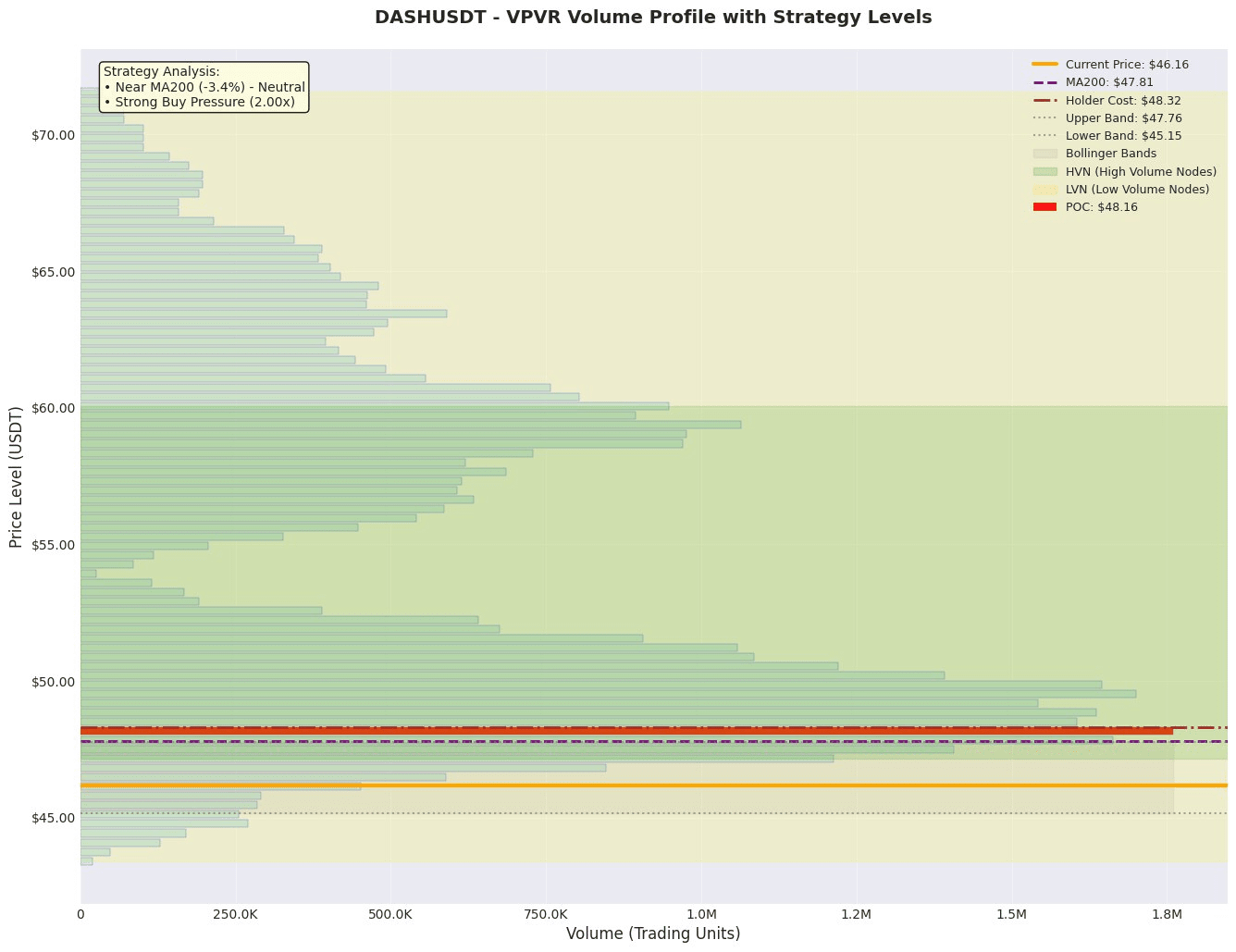 3. Hohe Handelsvolumen/Clusterbereich (HVN): Der POC (48.16) ist ein klarer Bereich mit hohem Handelsvolumen, der den primären Widerstand darüber bildet. Darüber hinaus ist die obere Grenze des Value Area bei 63.44 ein weiterer starker Widerstandsbereich. Unterhalb gibt es keine offensichtliche nahe HVN-Unterstützung, daher sollte die Unterstützung an der unteren Bollinger-Band-Grenze von 45.15 und dem Hauptkäuferbereich um 43.0 beobachtet werden.