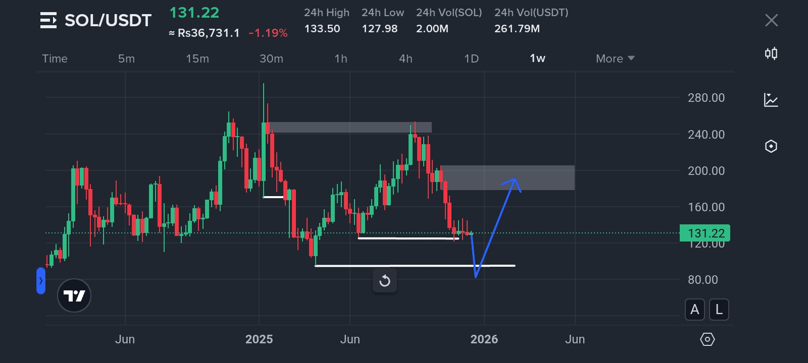 Im wöchentlichen Zeitrahmen hat SOL ein bedeutendes strukturelles Tief bei $170.25 durchbrochen, was einen klaren Trendwechsel von bullisch zu bärisch markierte.