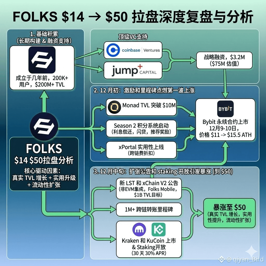 Folks Finance 成立于几年前,已积累 200K+ 用户、$400M+ TVL ATH(当前约 $200M+),并在 8 个链上运行。11 月初 TGE(代币生成事件)后,价格从 $2 低点起步,受益于 Binance 上市(现货和期货,最高 50x 杠杆)和顶级 VC 支持(如 Coinbase Ventures、Jump Capital)。11 月 14 日,他们完成 $3.2M 战略轮融资,估值达 $75M,这为后续扩张提供了资金和信心。